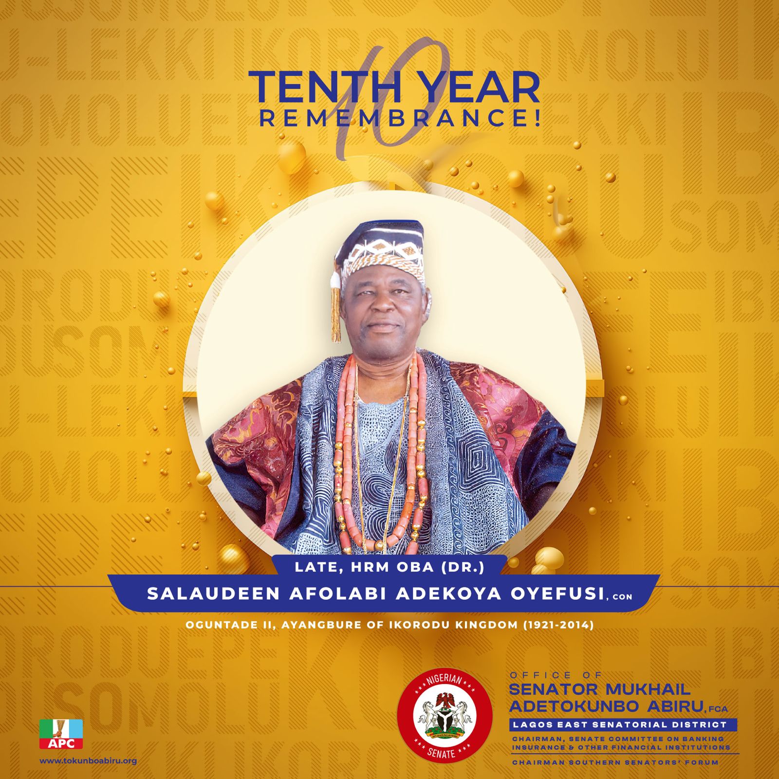 Today, we affectionately remember our Late revered royal father, The Ayangbure of Ikorodu and the Paramount Ruler of Ikorodu Division, Late HRM Oba (Dr) Salaudeen Afolabi Adekoya Oyefusi, CON (Oguntade II), ten years after joining his ancestors.