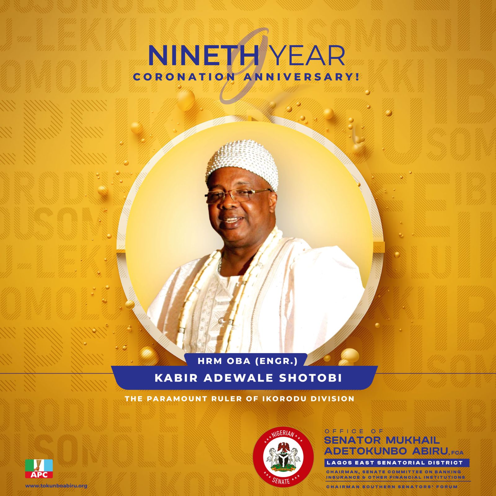 We join the eminent personalities across Lagos State and the good people of Ikorodu to celebrate our revered royal father, The Paramount Ruler of Ikorodu Division, The Ayangbure of Ikorodu, His Royal Majesty, Oba (Engr.) Kabir Adewale Shotobi, on your 9th coronation anniversary.