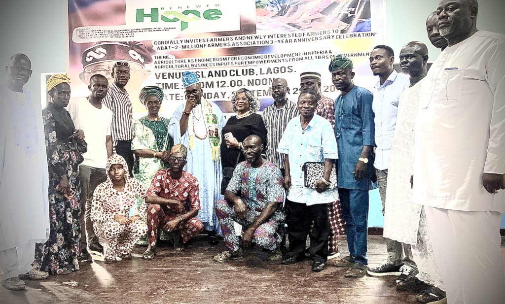 The Office of the National Coordinator / BOT-Chairman of the ABAT 2-Million Farmers Association— Apostle Farmer Hon. Victor Olusegun Odunsi (B.Agric, UNIFE, 1988; MBA, Marketing, LASU, 1998), Deputy Chairman, BOT and Mrs. O.O.T. Benson (Retired Permanent Secretary & Pioneer Executive Chairman, LASUBEB, Maryland, Lagos State), hereby extend a congratulatory message to all participants of the ABAT 2-Million Farmers Association’s Third Anniversary Celebration and Annual Lecture Series held at the Island Club on September 29, 2025. This message acknowledges the valuable contributions and presence of all attendees.
