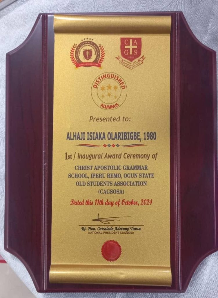 In 2024, Aare Isiaka Mustapha Olaribigbe received the distinguished alumnus award during an inaugural ceremony presented by the National President of CAGSOSA, Honourable Orisalade Adetunji Taiwo.